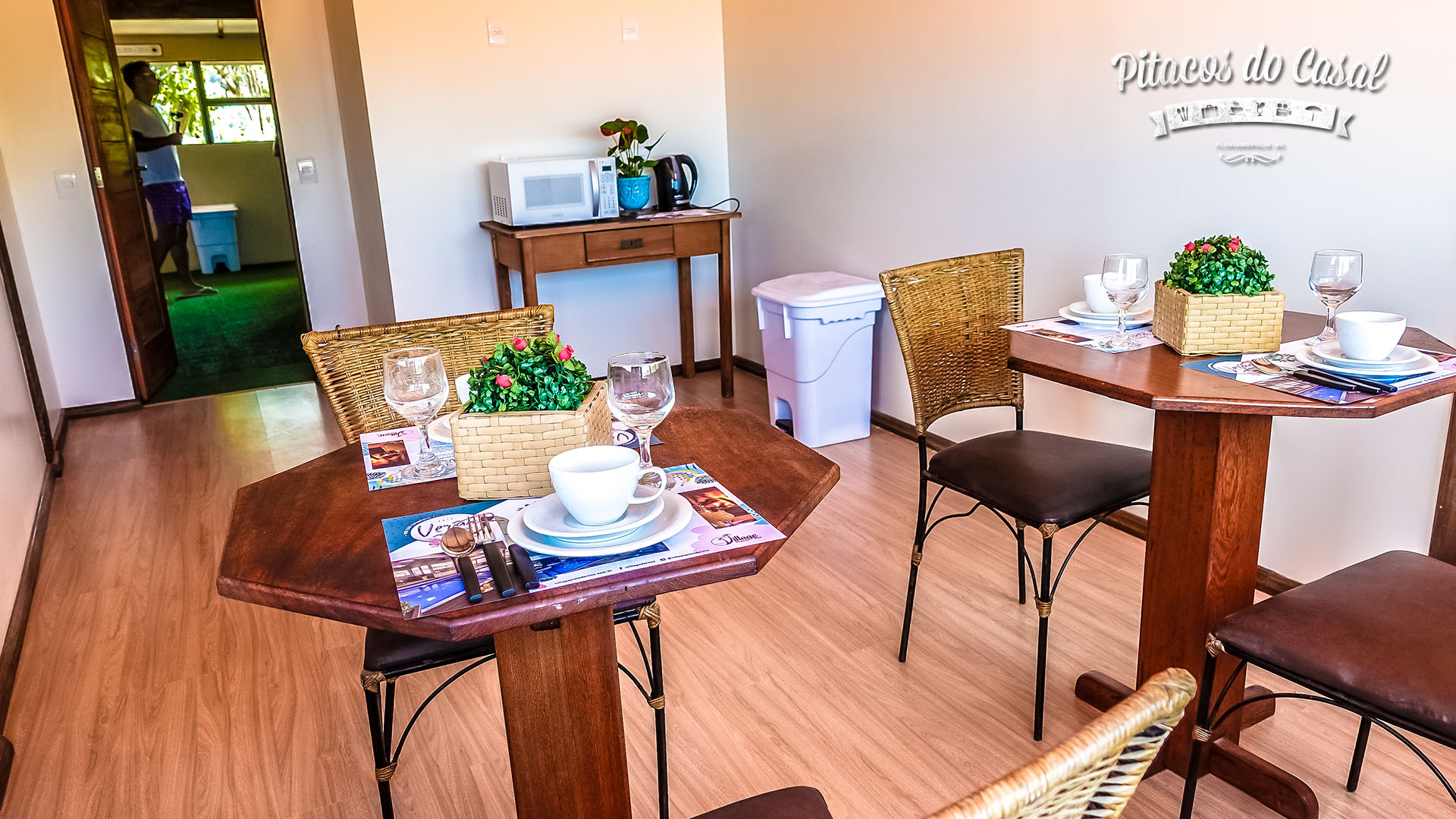 Nesse espaço há, também, uma área com mesas e microondas, para pequenas refeições para quem está hospedado nas suítes. Lembrando que nas casas a estrutura é completa, com cozinha e utensílios.