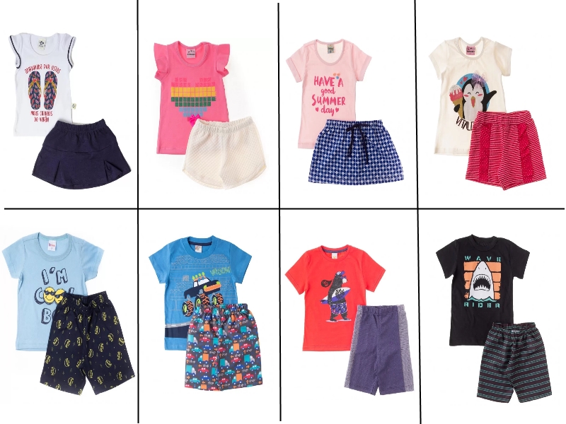 Não mora em lugar frio ou já está pensando no verão? Tem promo de 5 conjuntos de verão por R$100, de blusinha e shorts, para meninos ou meninas. Confere alguns modelos que selecionei: