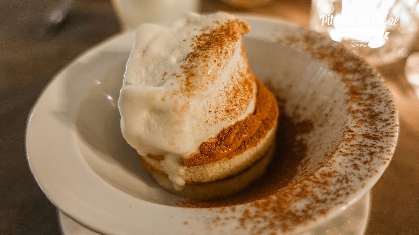 A sobremesa com certeza surpreendeu com torta individual de pão de ló bem macio, recheada de doce de leite produzido na casa, doce sem ser enjoativo.