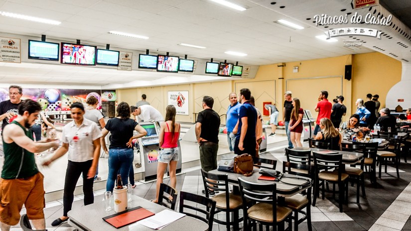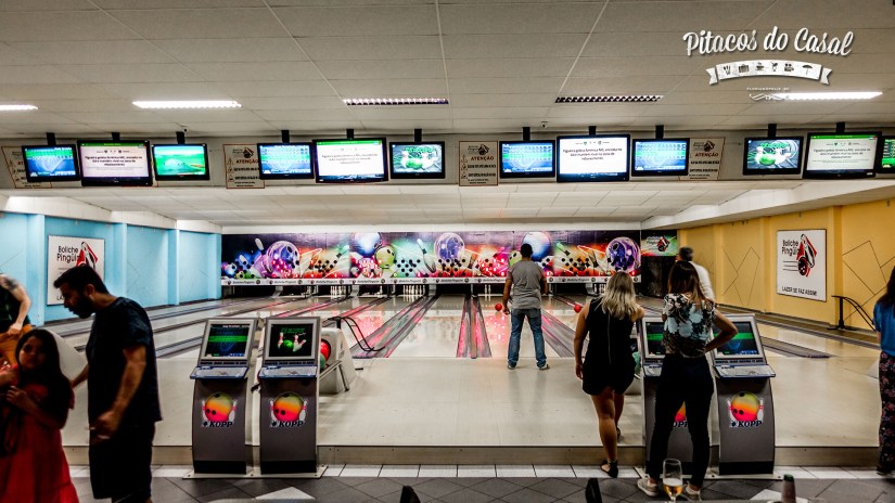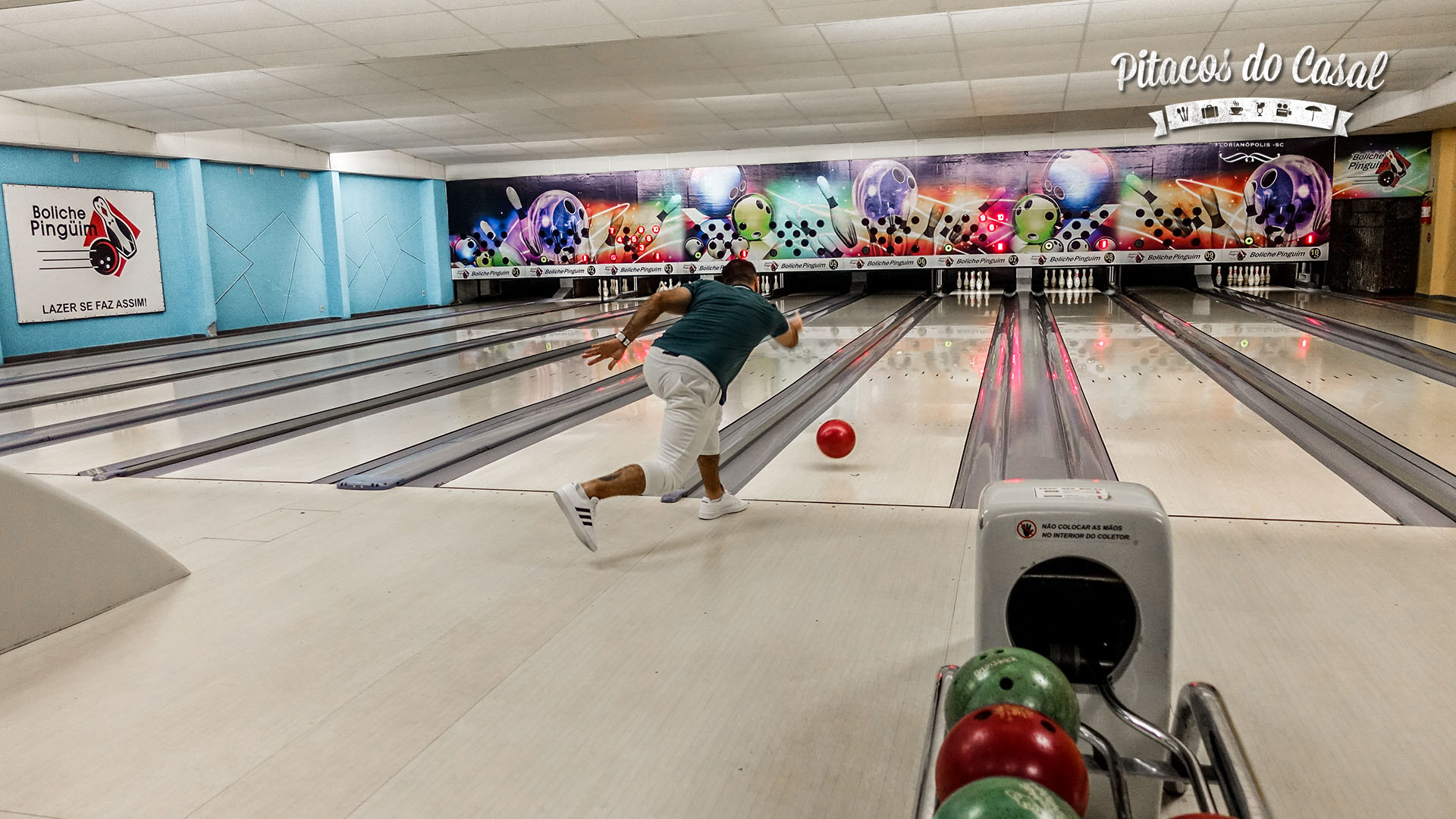 Fomos então jogar boliche com alguns amigos, no Boliche Pinguim, que fica em São José, pertinho de Florianópolis. Além das pistas de boliche, o Boliche Pinguim também tem um cardápio bem bacana com lanches, pizzas e porções, então, além do jogo, também é um bom ambiente para fazer uma happy hour e comemorar. Enquanto um joga, os outros acompanham e podem ficar na mesa conversando e beliscando.
