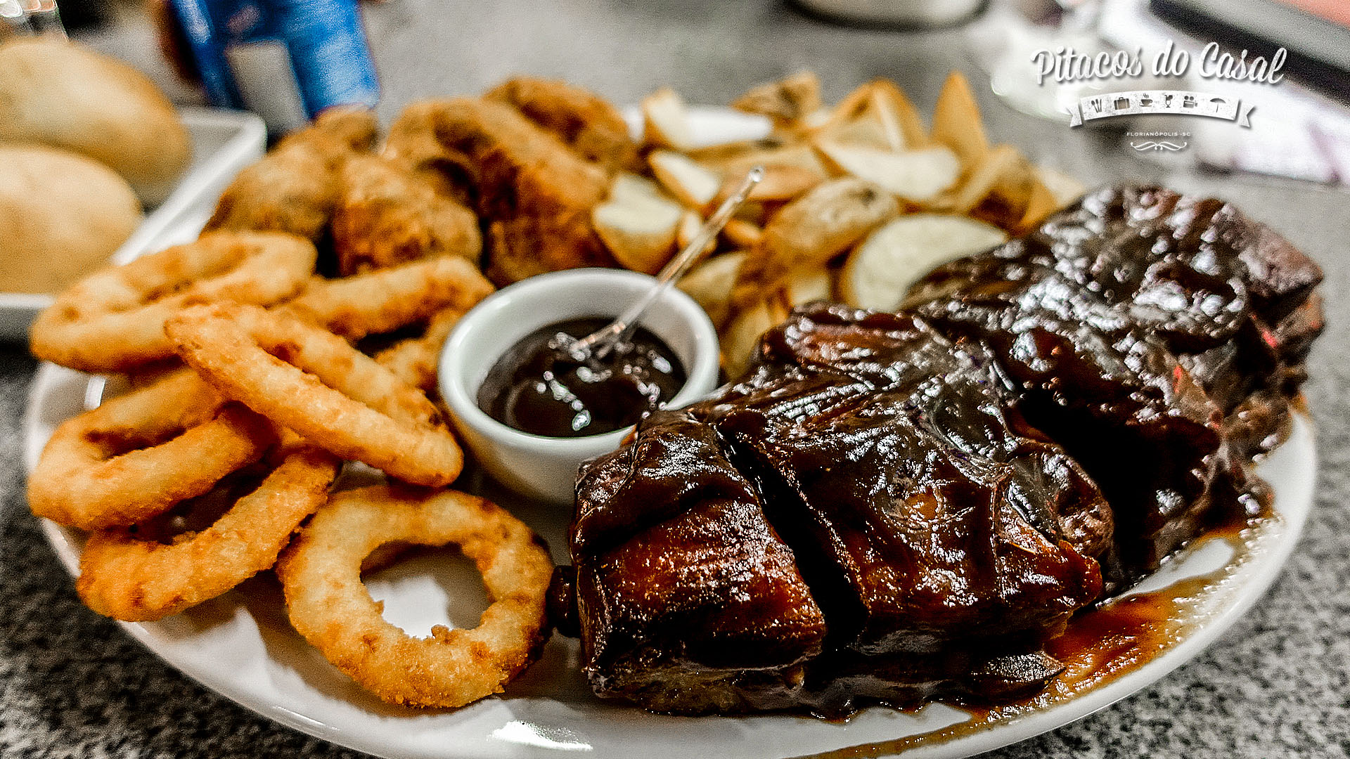 – Combo Pinguim, com costelinha suína ao barbecue, drumets, onion rings e batata rústica.
