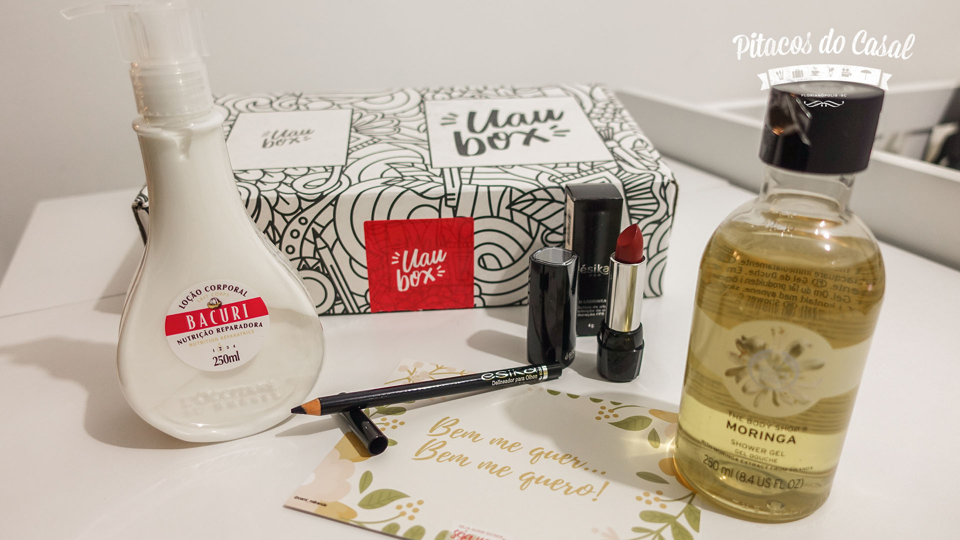 Todo mês recebo a caixinha da UAU Box, que é muito amor. São normalmente 4 produtos de beleza – pode ser para corpo, rosto, cabelo… e as caixinhas não são necessariamente iguais para todas as assinantes.