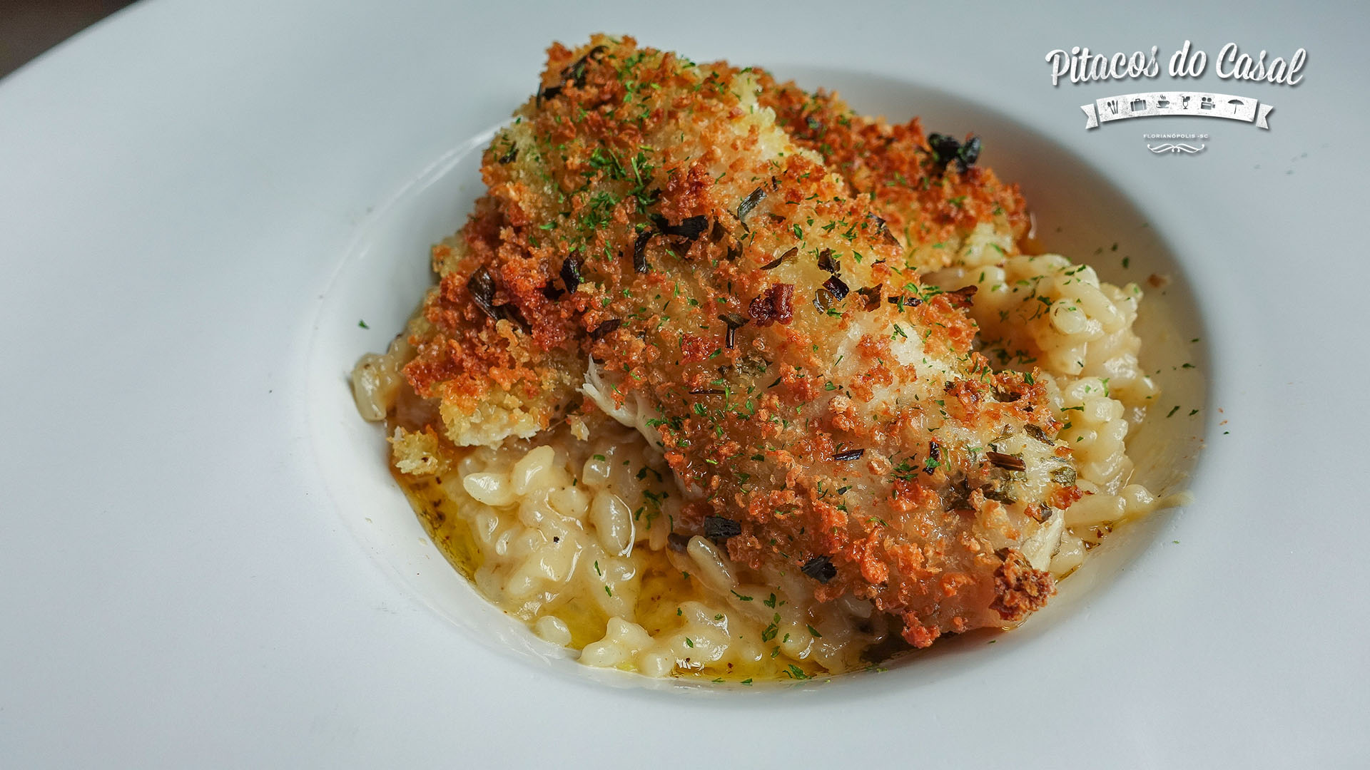 A Jô foi de Pesce in crosta di erbe com risotto all’aglio nero (R$35,90) – tilápia com crosta de ervas acompanhado de risoto de alho negro e alho poró, um prato com uma carne bem leve, a cara do verão. A tilápia é bem macia, e vem com a crocância da crostinha de ervas, que também dá o sabor ao peixe. O risoto veio bem cremoso e saboroso, com o gostinho do alho.