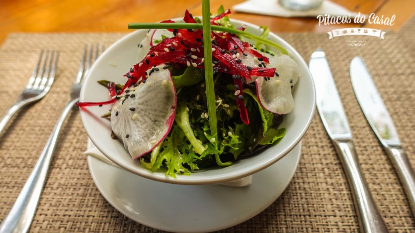 As opções são: Carpaccio com rúcula, frango com purê de batatas, rigatone com ragu de costela suína, spaghetti carbonara, abobrinha recheada com queijo e bisteca suína milanesa com purê de abóbora. Antes do prato principal, é servida uma salada com folhas verdes, beterraba e rabanete.