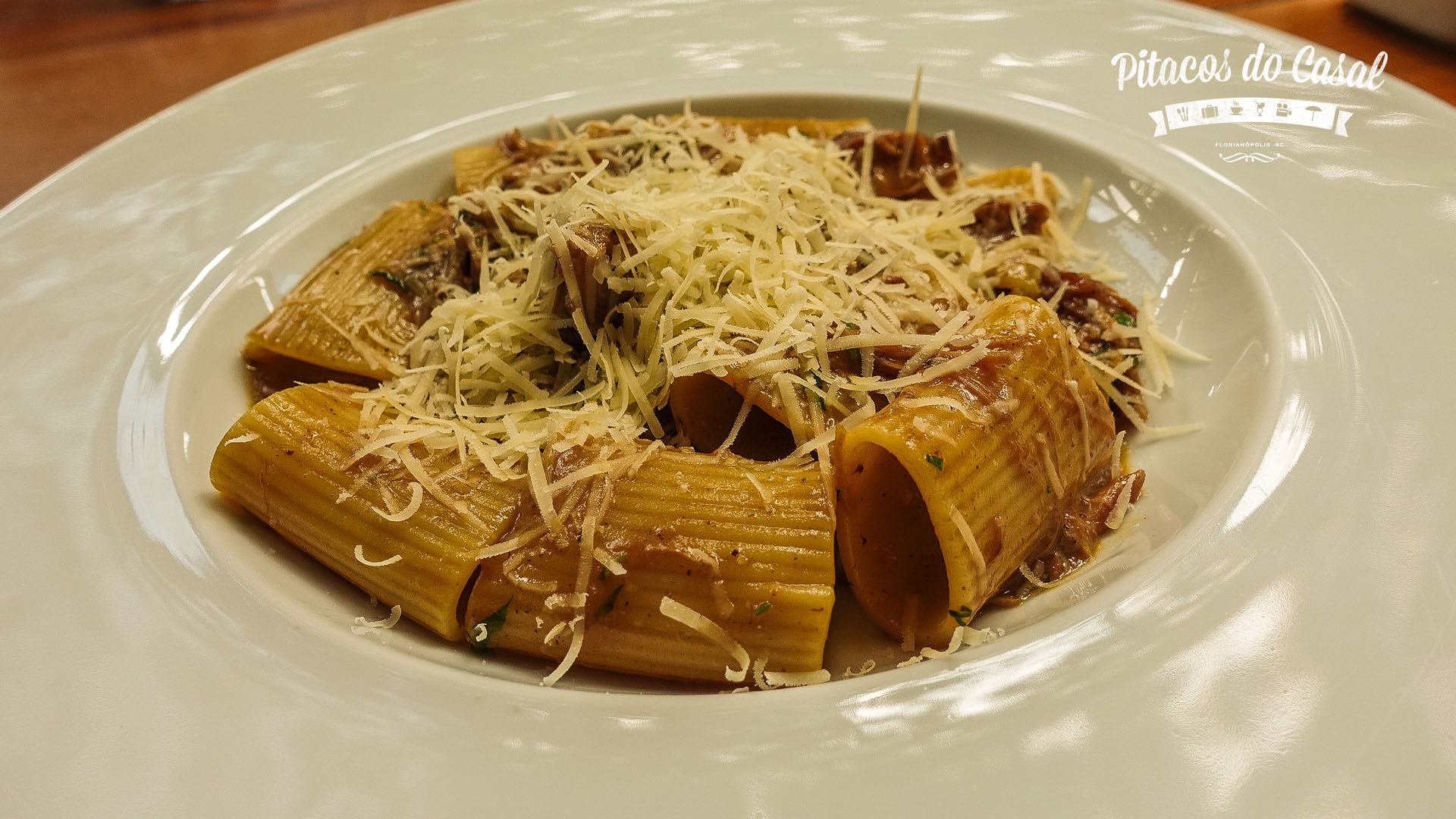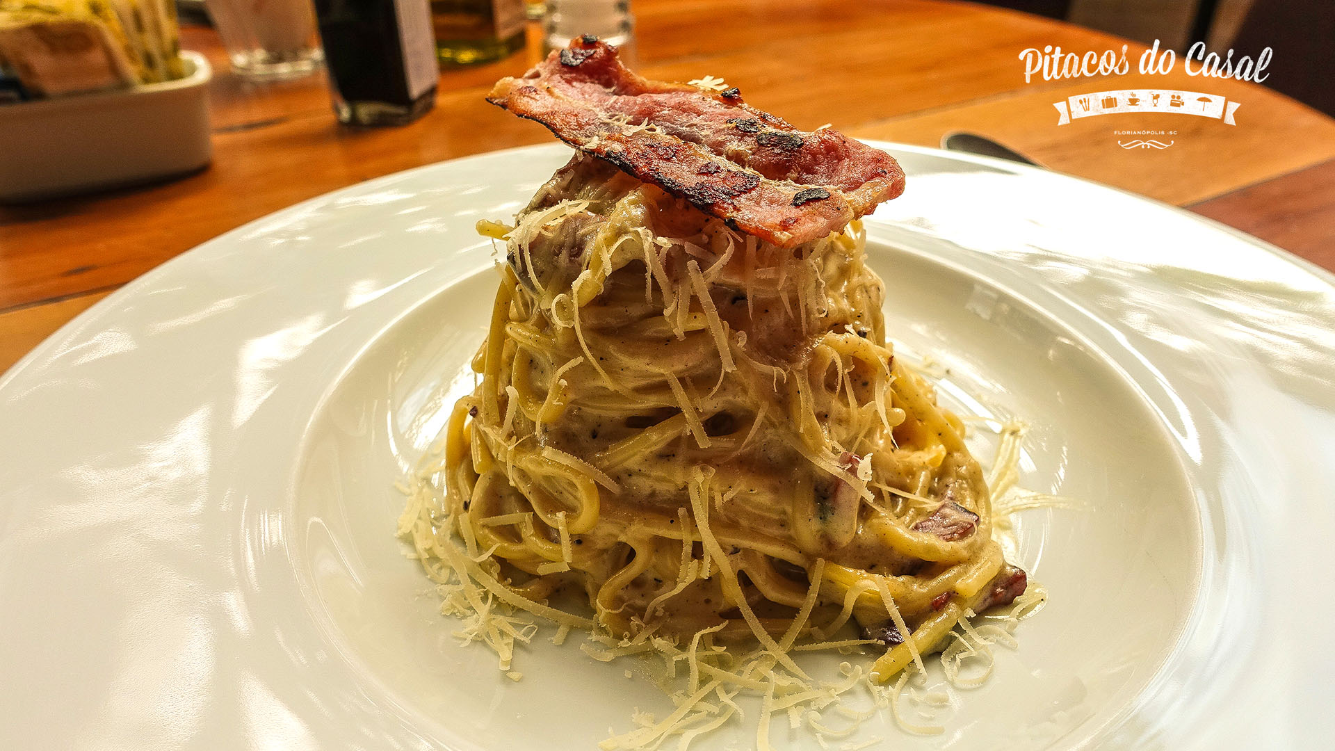 Dessa vez a massa nos chamou, e o Marcos pediu o Maccheroni Genovese e a Jo o Spaghetti Carbonara. O Maccheroni Genovese é uma massa (rigatone) servida com ragu de costela suína confitada na cebola caramelizada. O prato é bem encorpado, tanto por ter a massa quanto pelo molho de costela, que é bem consistente (e bem saboroso). O Spaghetti Carbonara é um clássico da cozinha italiana, leva massa com gemas de ovos, pancetta, creme de leite e parmesão, e estava delicioso, comi tudinho e não mudaria nada.