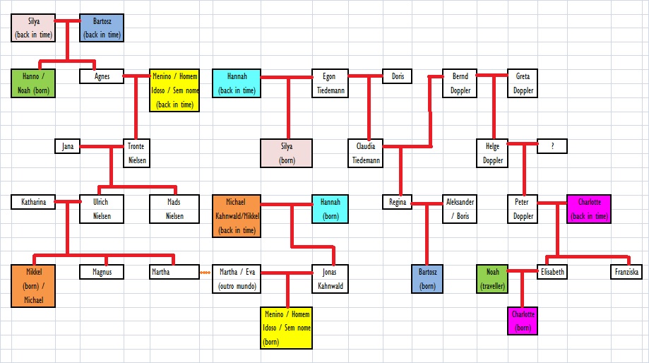 Quando acabamos de assistir, fiquei imaginando as conexões entre todos, e resolvi colocar no papel a árvore genealógica que imaginei e que liga todos os personagens. Na verdade, a árvore com os personagens que viajam no tempo teria que ter 3 dimensões para conectar os ramos de cada família. Mas enfim, coloquei numa ordem cronológica dos personagens, repetindo os que viajam no tempo, marcando estes com quadradinhos coloridos.