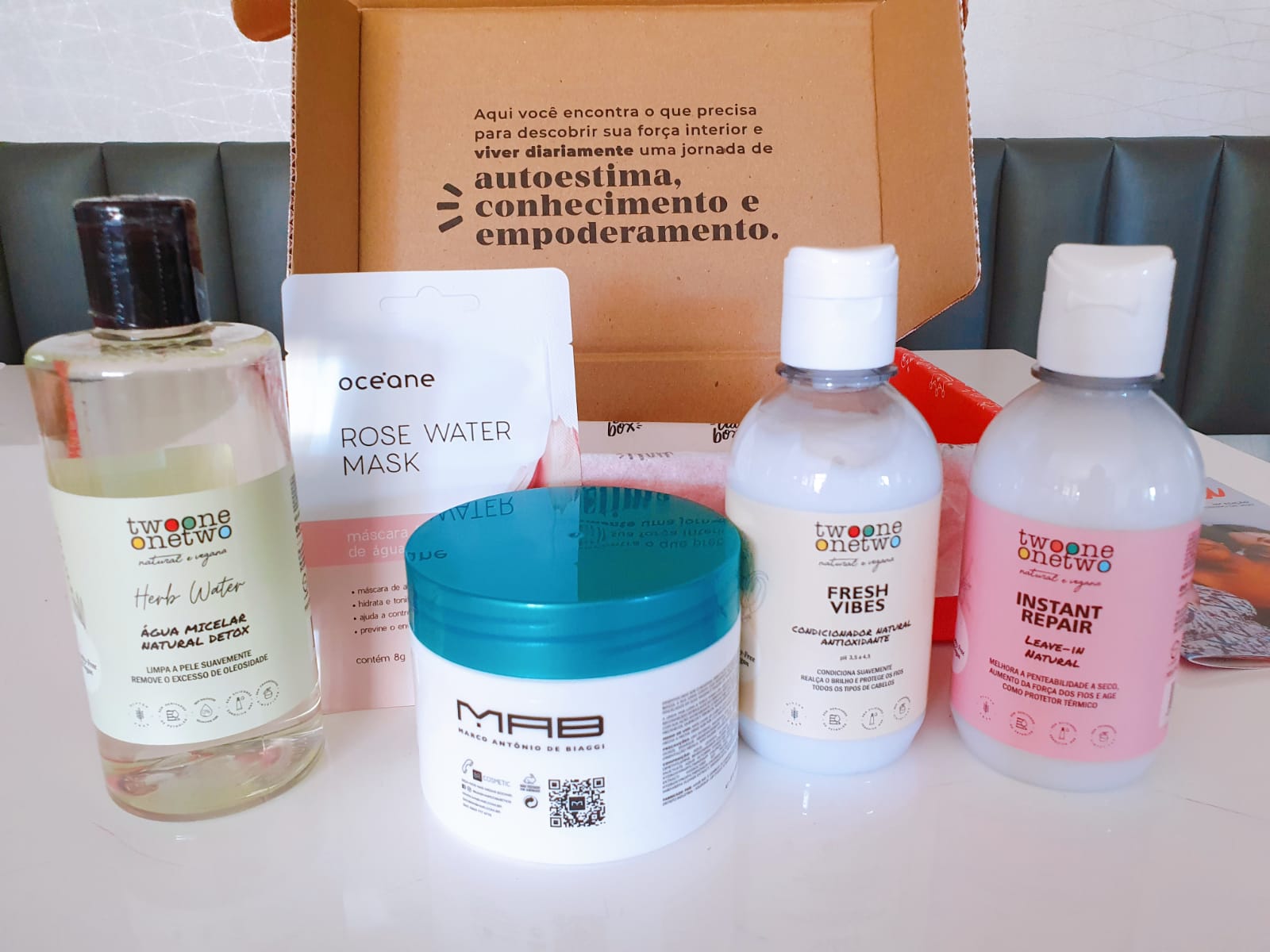 Todo mês eles mandam produtos diferentes, e minha box de fevereiro veio assim: