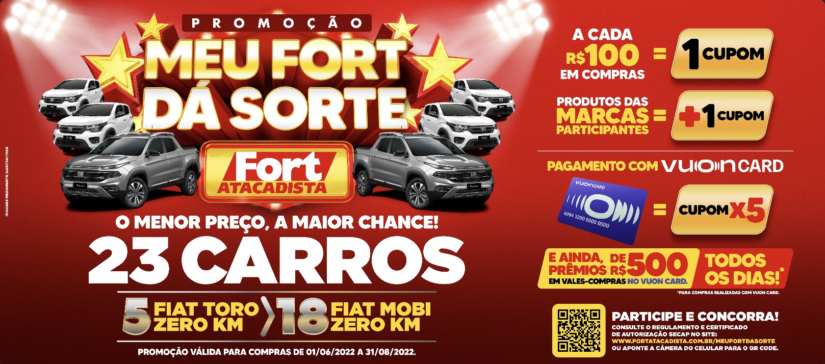 Os clientes do Vuon Card, o cartão de crédito próprio do Fort Atacadista, têm vantagens especiais: cada compra efetuada com o Vuon garante 5 vezes mais cupons para concorrer aos veículos e o direito de concorrer a prêmios em dinheiro de até R$ 500 por dia pela roleta de prêmios exclusiva Fort Atacadista. Todos os sorteios são auditados pela Loteria Federal.