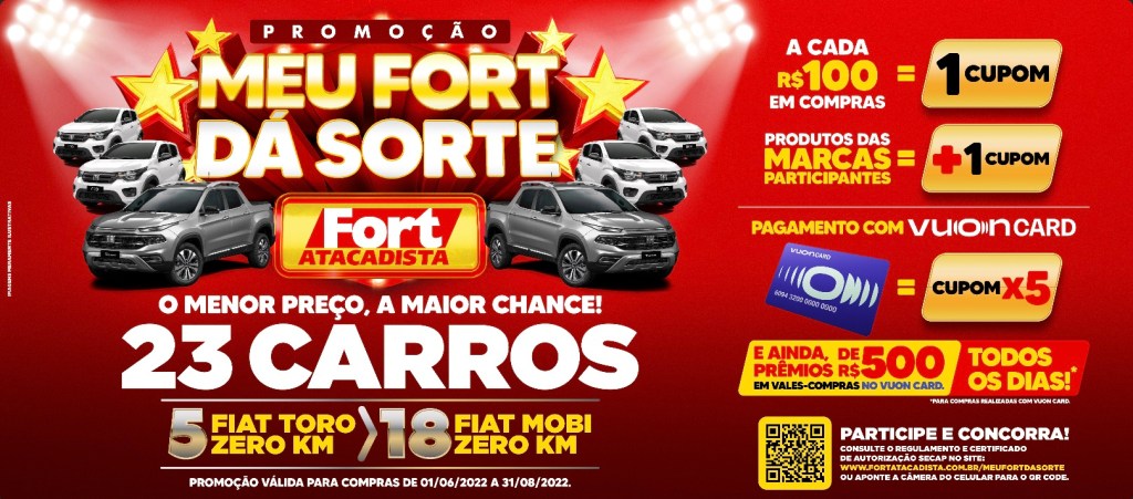 A campanha “Meu Fort dá Sorte” está de volta a partir de 1º de junho, em todas as lojas do Fort Atacadista no país, presente nos estados de Santa Catarina, Mato Grosso, Mato Grosso do Sul, São Paulo e no Distrito Federal. A segunda edição da campanha promocional vai sortear 23 automóveis zero quilômetro – cinco Fiat Toro e 18 Fiat Mobi – e prêmios diários em créditos no Vuon Card, até o dia 31 de agosto. Para participar basta realizar compras a partir de R$ 100 em qualquer uma das 48 unidades do Fort Atacadista e cadastrar os cupons no site oficial: www.meufortdasorte.com.br.