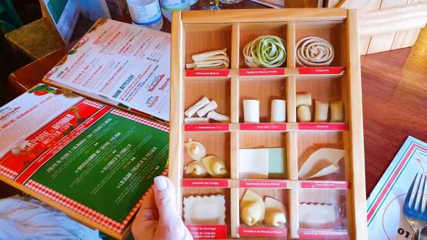 Nos pratos de massa, há opção de escolha do tipo da massa e recheios. Achei bem bacana que eles apresentam um cardápio físico das massas. Assim, quem não está acostumado com os nomes dos tipos de massas, pode ver e escolher com base no visual.