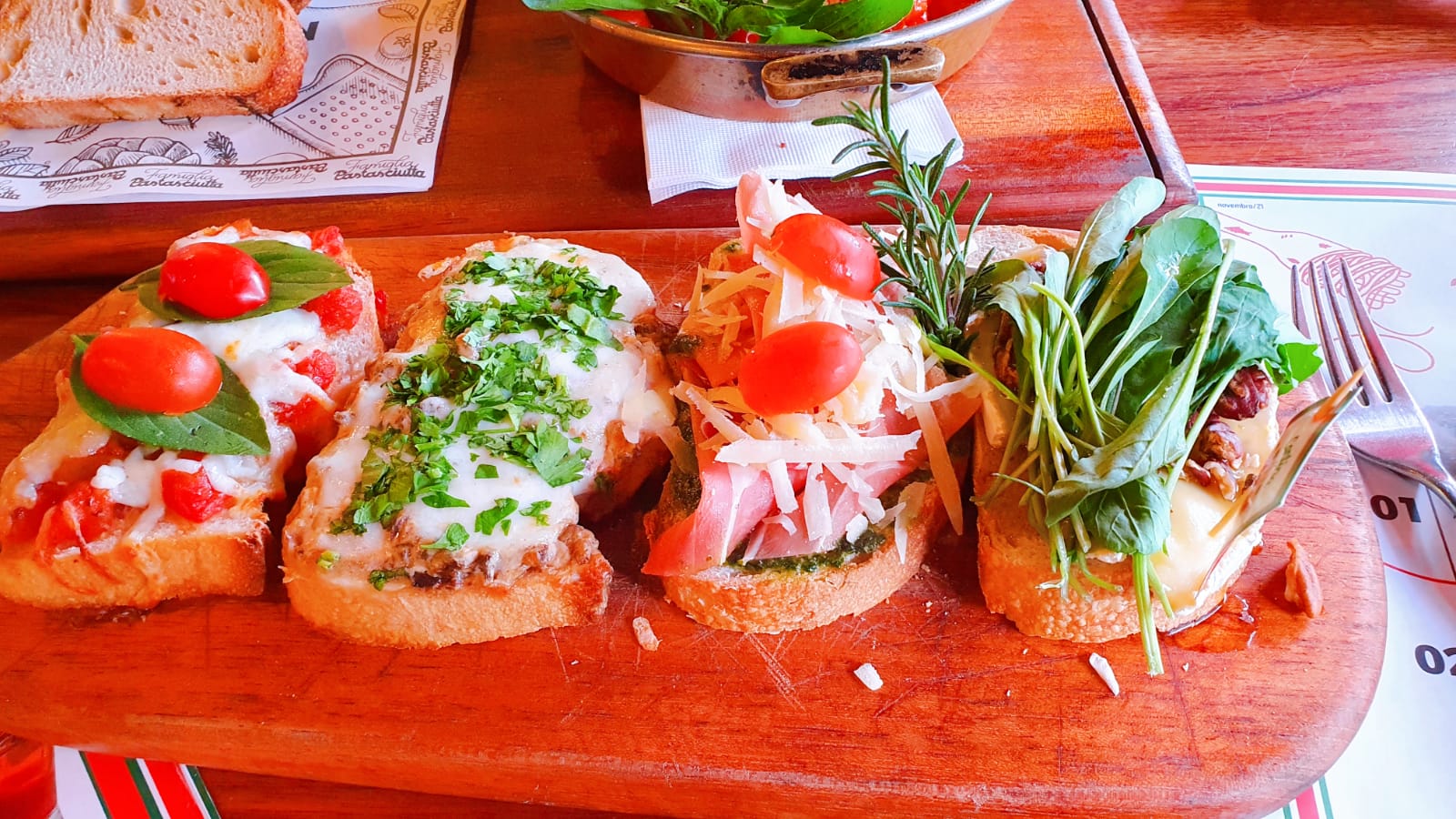 São servidas 4 Bruschettas: caprese; rúcula, queijo brie, nozes e mel; quatro queijos e cogumelos; e pesto com parma e lascas de grana padano. A apresentação das bruschettas é linda, já nos enche de vontade de comer!