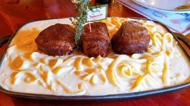 Passando para o prato principal, fomos de outro mais pedido: Medaglione Quattro Formaggio, ou medalhão quatro queijos – 3 unidades de medalhão de filé grelhado (150g cada), com taglierini quatro queijos. Segundo o cardápio, esse prato serve 2 pessoas. Mas garanto que mesmo aquela pessoa que diz “Mas olha, eu como por 2”, vai sair satisfeita! É servido em uma travessa e vem MUITA massa! E não é uma massa qualquer, com um molho de queijo delicioso!