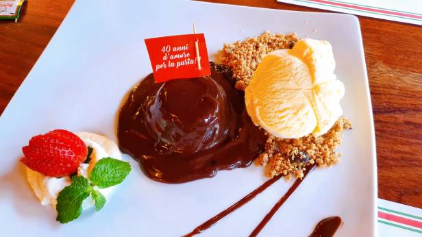 O Marcos é sempre fã de petit gateau, e aproveitou o bolinho de chocolate, com calda de chocolate, sorvete de baunilha, chantilly e morango. Sem chance de errar no pedido.