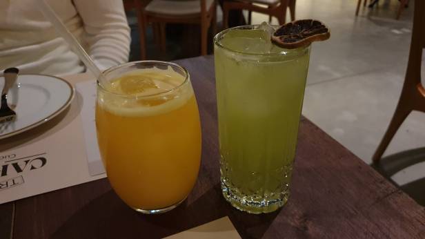 Como no momento não estávamos bebendo álcool, fomos de suco de laranja e um drink não alcoólico com pesto, que casou bem com a comida italiana.