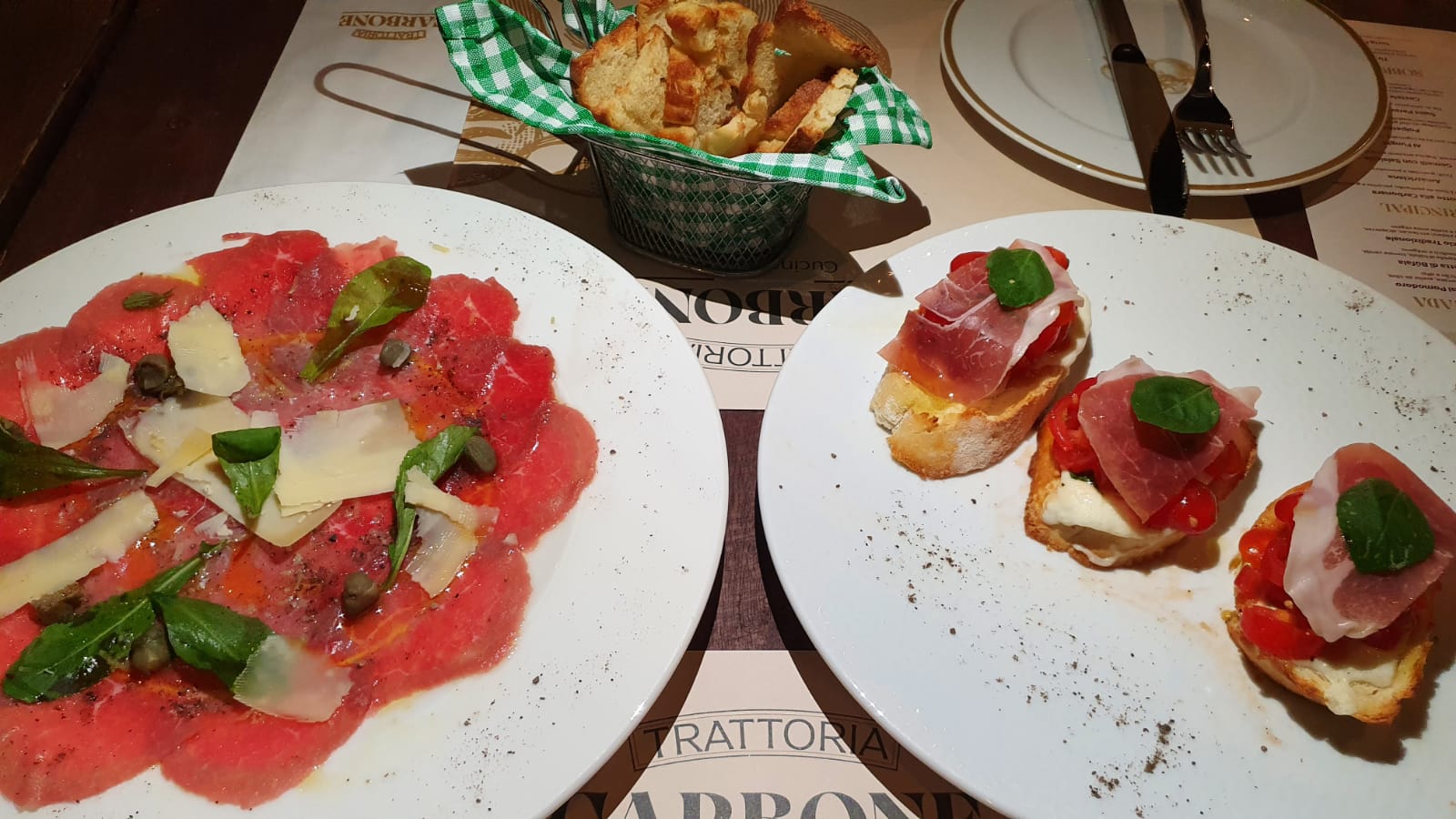De entradas, Carpaccio Tradizionale (com grana padano em lascas, alcaparras, rúcula e azeite extra virgem) e Bruschetta di Bufala (pão tostado com mozzarella di bufala, tomate cereja, parma, basílico e orégano), ambos saborosos e aprovados!