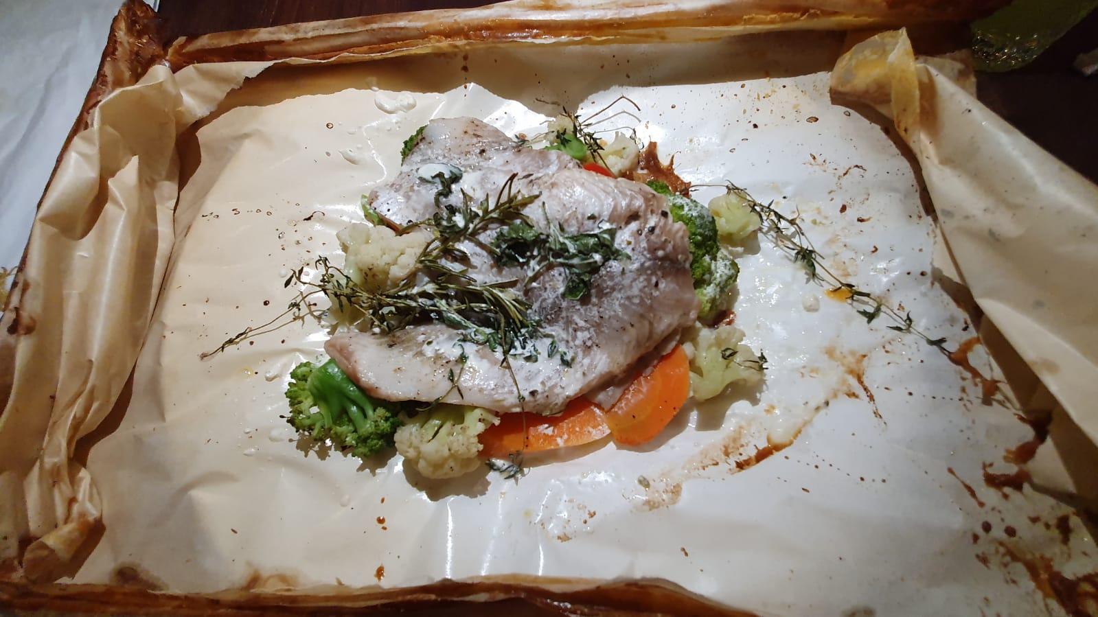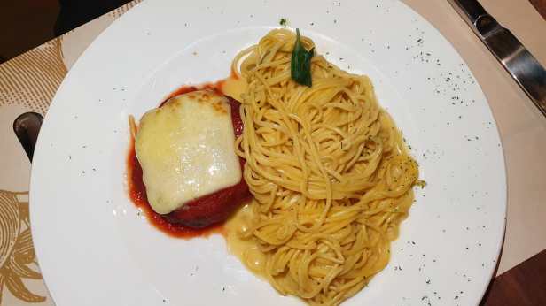 Como principal, o Marcos foi no tradicional Polpettone – almondega gratinada com queijo, servida com spaghetti, manteiga e sálvia, e a Jo optou pelo fruto do mar oferecido: Saint Peter in Papillote – filé de Saint Peter com legumes salteados.