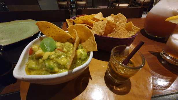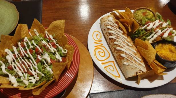 Como principal, escolhemos o Mariachi, que conforme o cardápio “serve 2 pessoas”, mas serviu MUITO bem nós 3 (2 adultos + criança 7 anos). Veio: 2 tacos camarão, nachos mignon, burrito machaca, guacamole, chilli beans queijo, nachos chips.