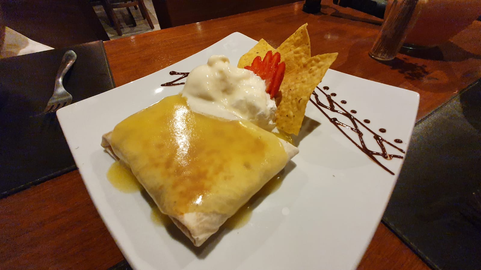 Para fechar, Tequileiro de postre, digo, sobremesa: trouxinha de tortilla recheada com morango e chocolate, coberto com calda de laranja e tequila flambada, servido com sorvete de creme.