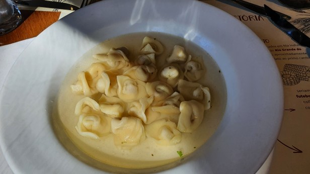 Inicialmente é servida uma sopa de capeletti, acompanhada de pão e queijo ralado. Posso dizer que se meu almoço seguisse apenas com essa sopa, eu já estaria realizada hehehe.