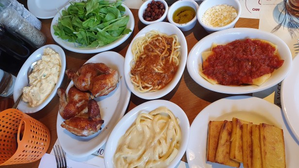 Na sequência, são servidos na mesa: galeto ao primo canto (super macio), polenta brustolada (na chapa), maionese de batata sem ovos, salada de radicci com bacon (bacon servido à parte) e massas.