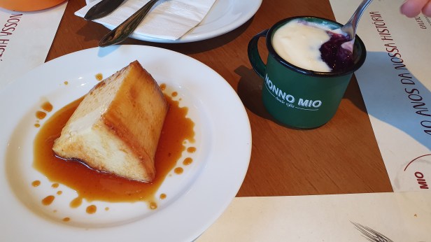 Por fim, para sobremesa são oferecidos pudim de leite e sagu com creme.