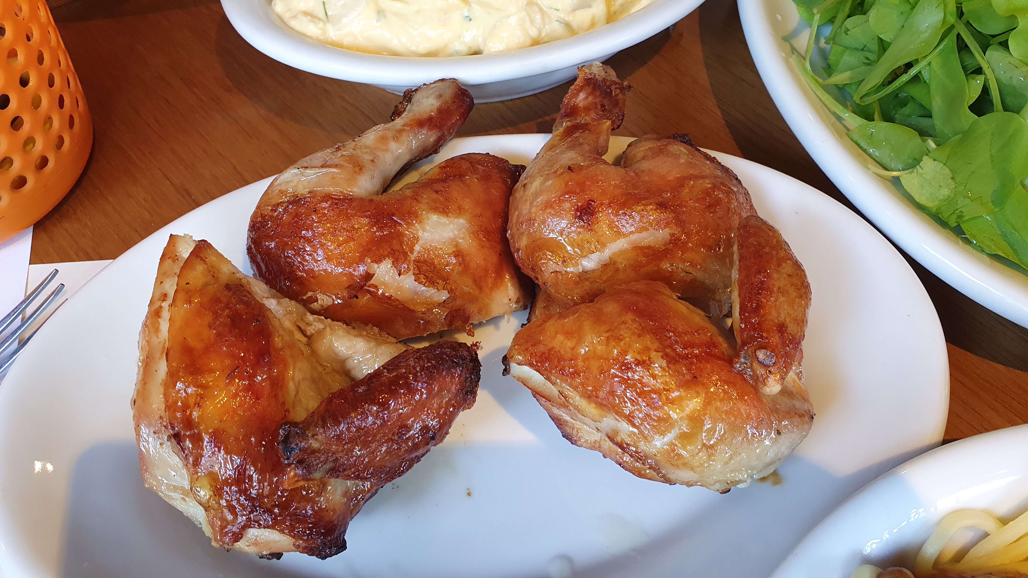 Na sequência, são servidos na mesa: galeto ao primo canto (super macio), polenta brustolada (na chapa), maionese de batata sem ovos, salada de radicci com bacon (bacon servido à parte) e massas.