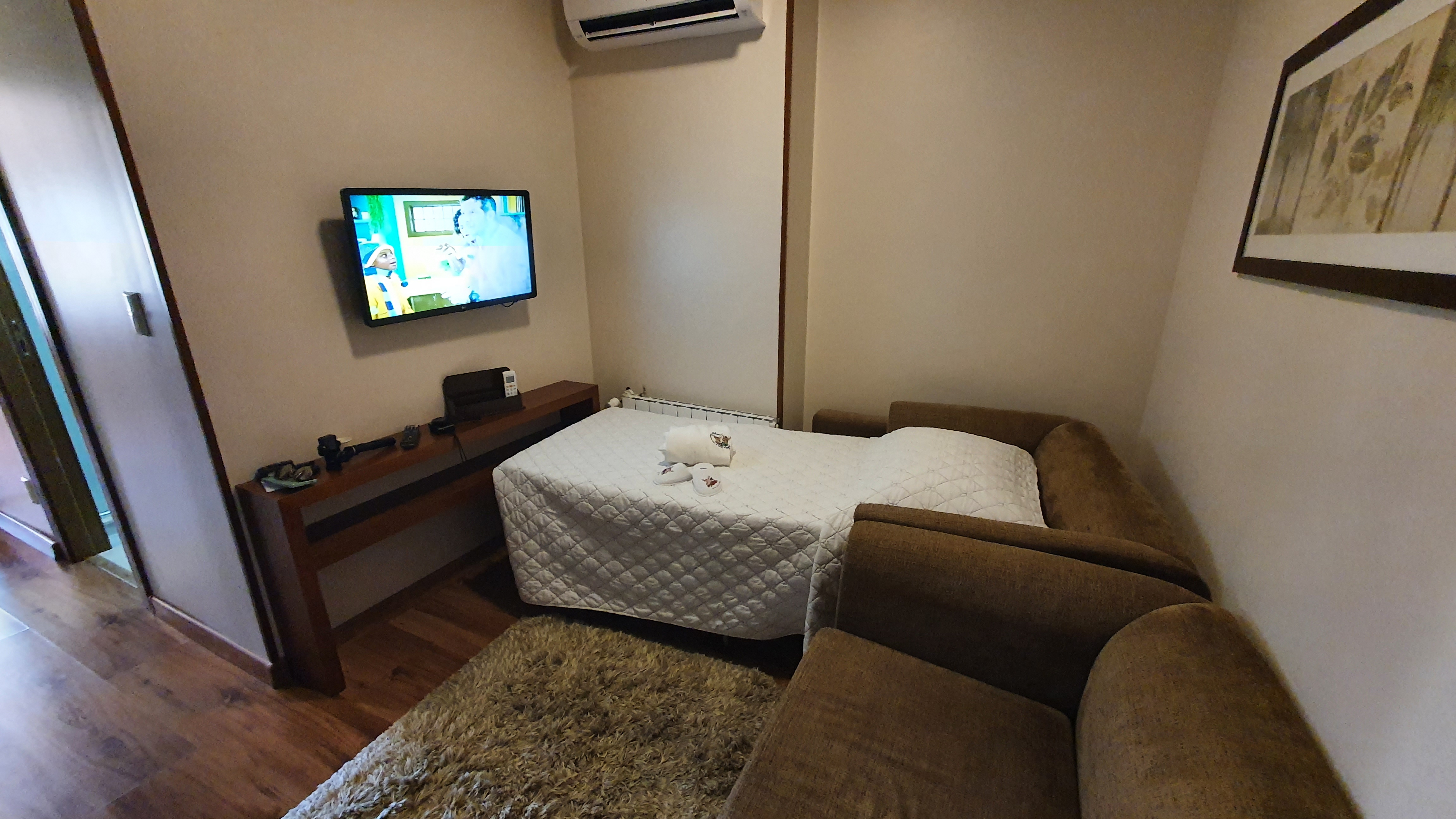Ficamos em um quarto para família que acomoda 4 pessoas. É um quarto bem amplo com cama de casal e uma antessala com 2 sofás-cama e TV ali também.