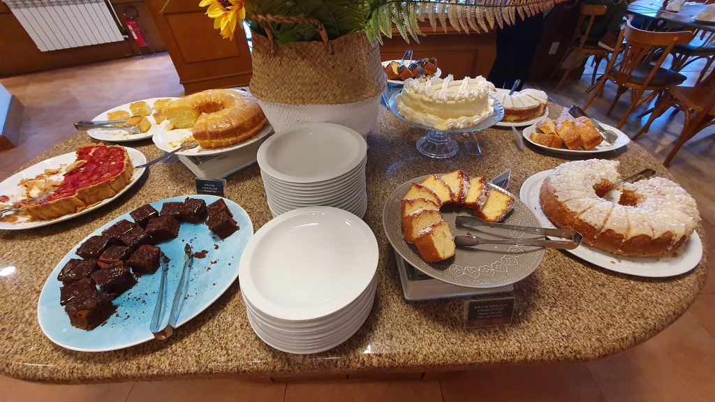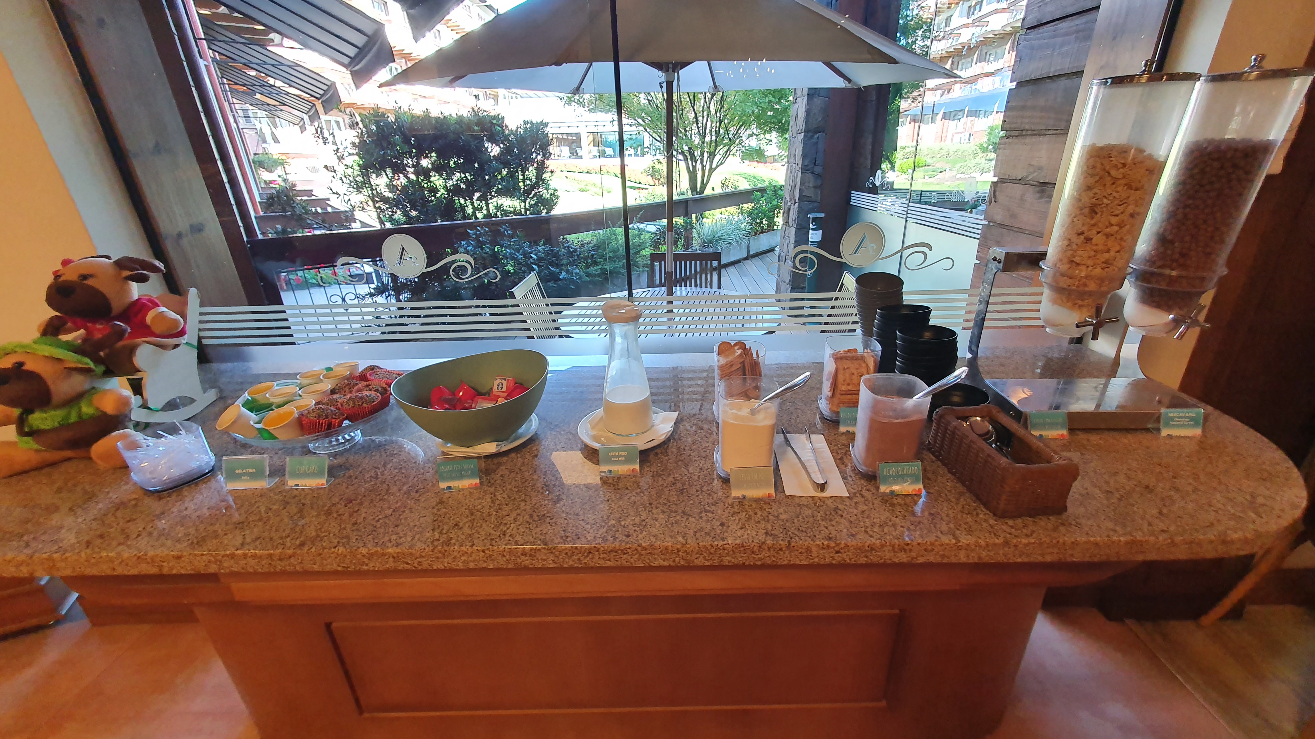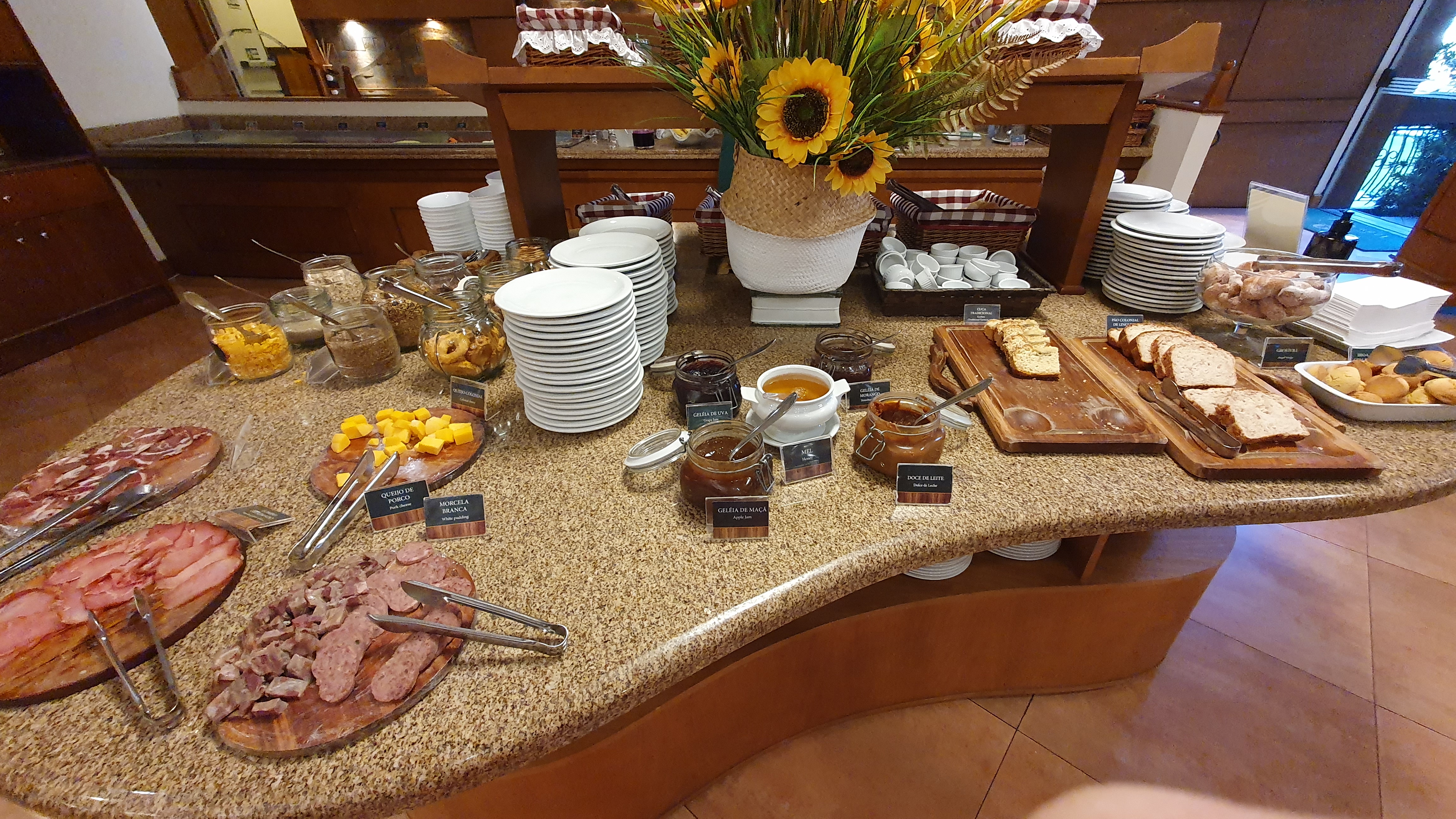 O café da manhã é servido no estilo buffet super completo com pães, bolos, salgados, frios, frutas, cereais, iogurte, sucos, cafés… é uma delícia e tem para todos os gostos!