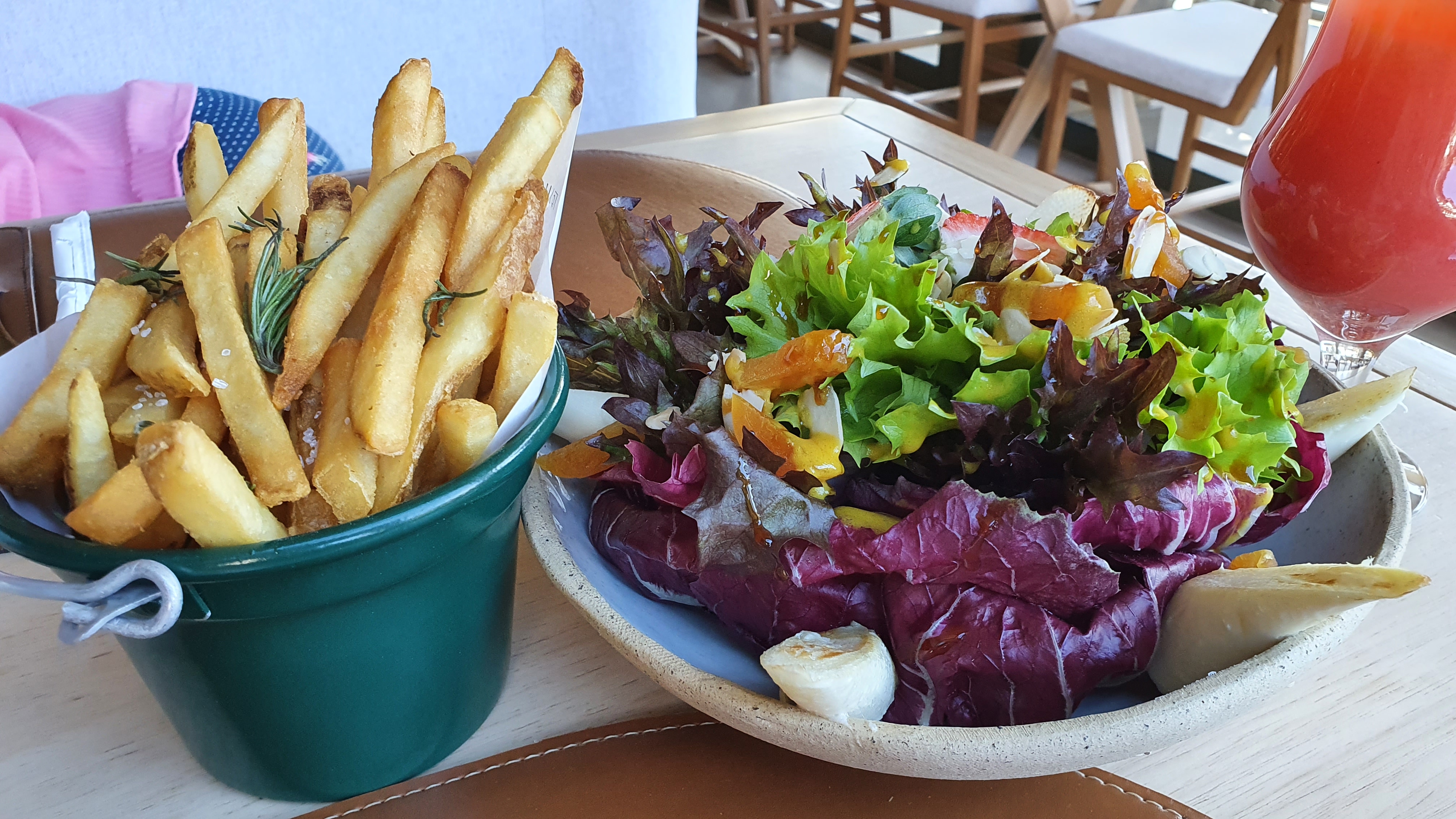 Para começar, pedimos Fritas Le Pin (R$42), batatinhas palito crocantes, finalizadas com sal e alecrim e a Le Pin Salad (R$52), salada com folhas, palmito, morango, damasco, amêndoas laminadas, com molho cítrico e melaço de cana, muito bem temperada!