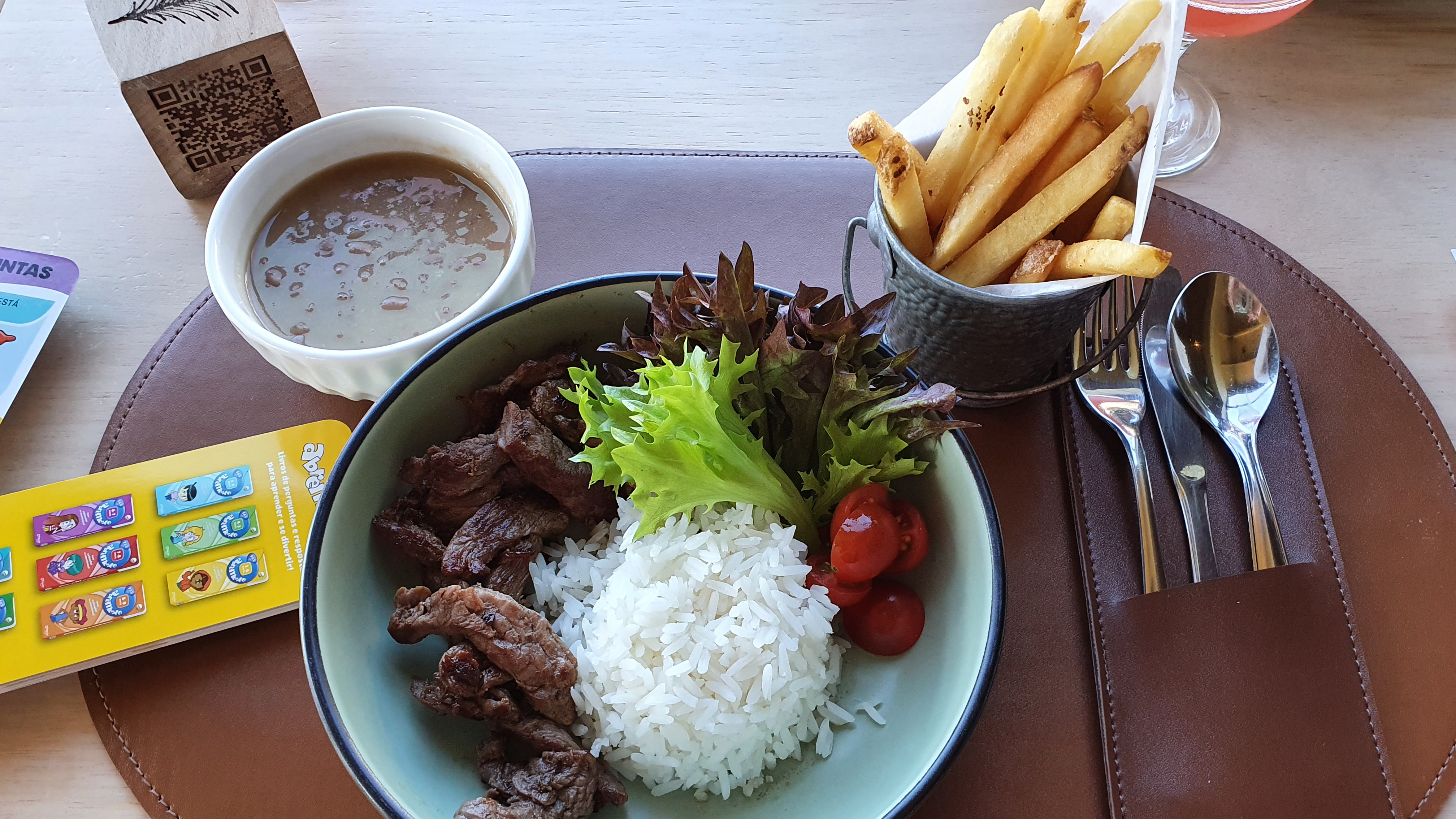 Também contam com Menu kids e nossa filha foi de Mini à la minuta de filé (R$73) – iscas de filé mignon, arroz branco, feijão carioca, batata frita e saladinha. Aprovadíssimo por nossa pequena!