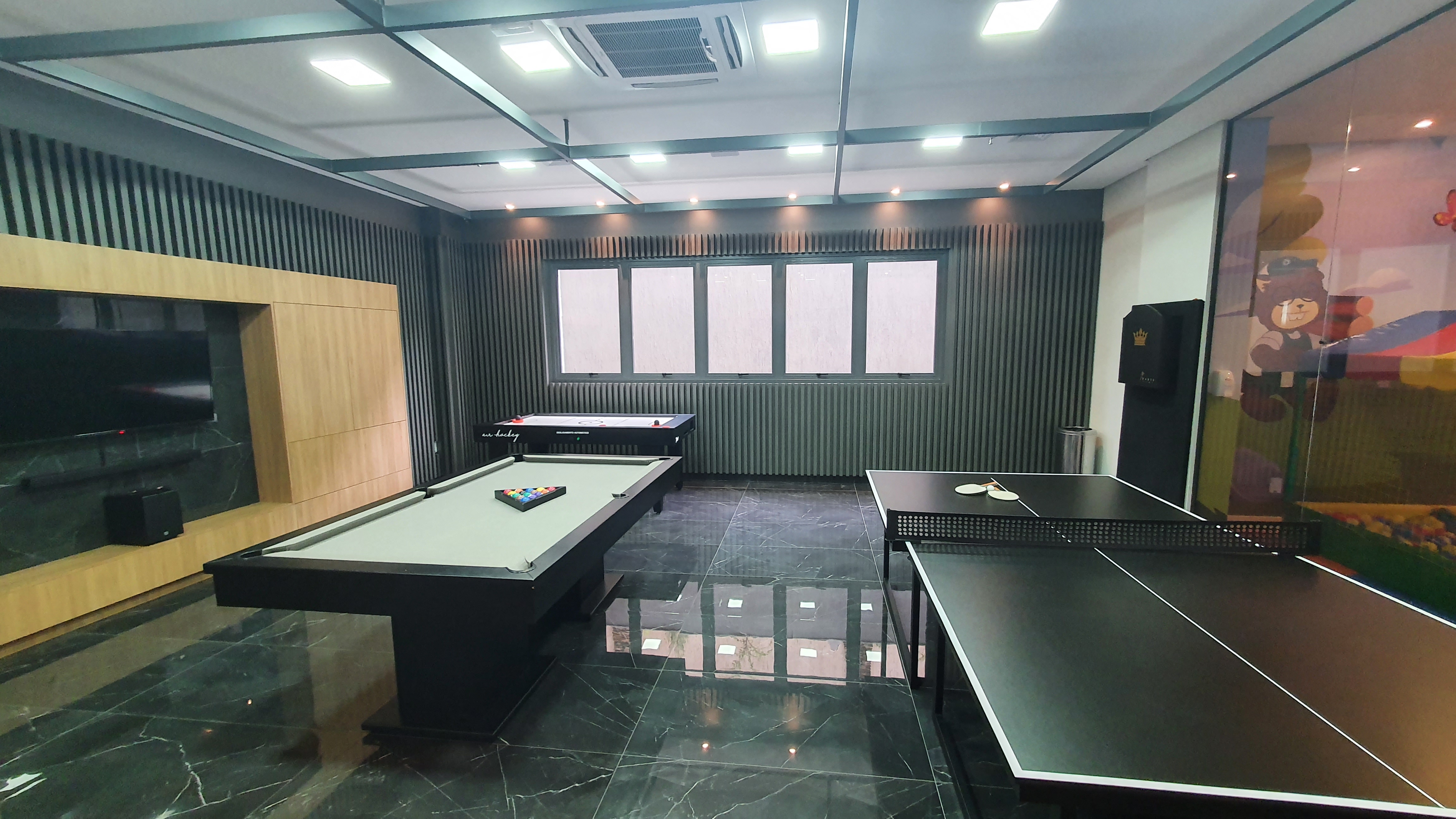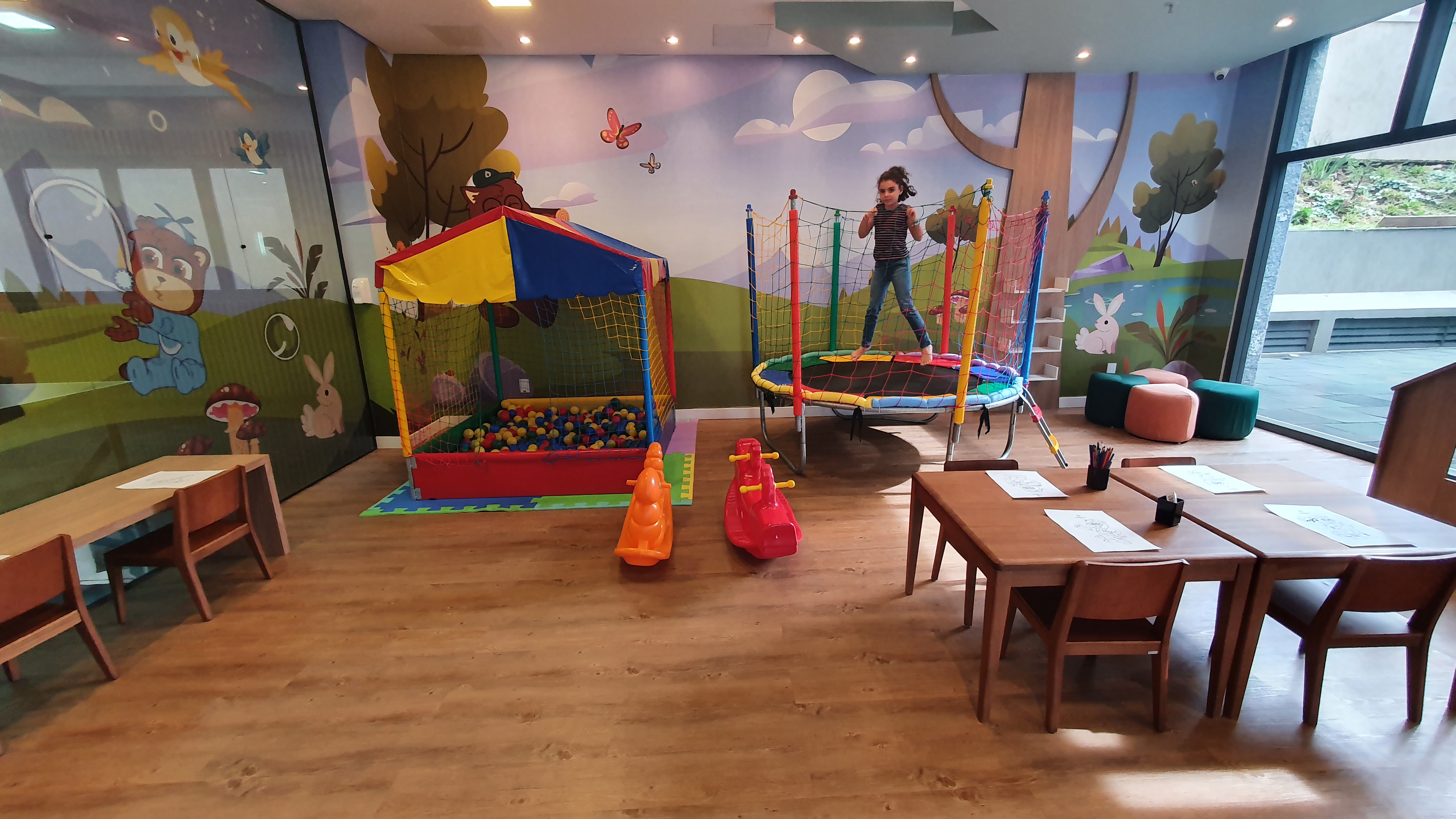 A área de lazer fica próximo à recepção, no andar térreo e é equipada com piscina coberta aquecida, sauna, academia de musculação, sala de jogo, brinquedoteca e parquinho.