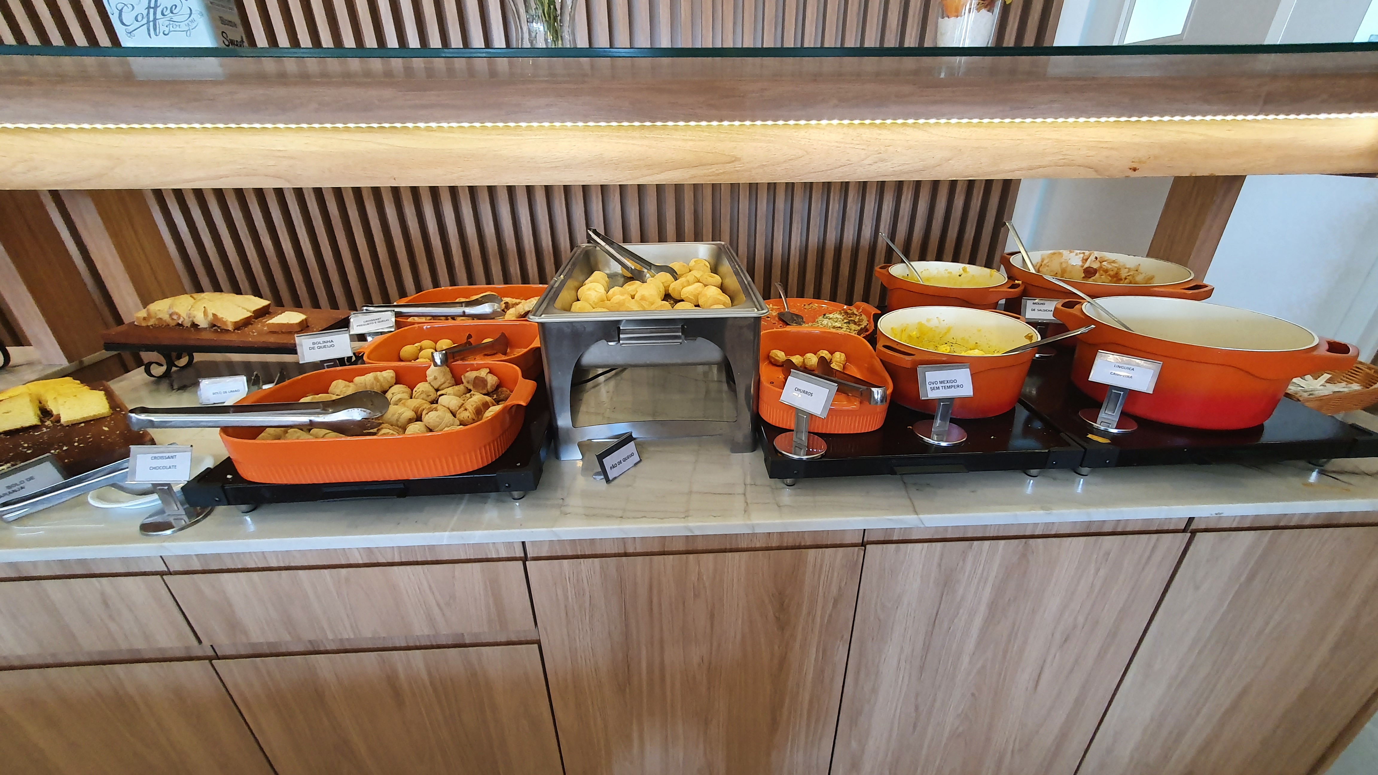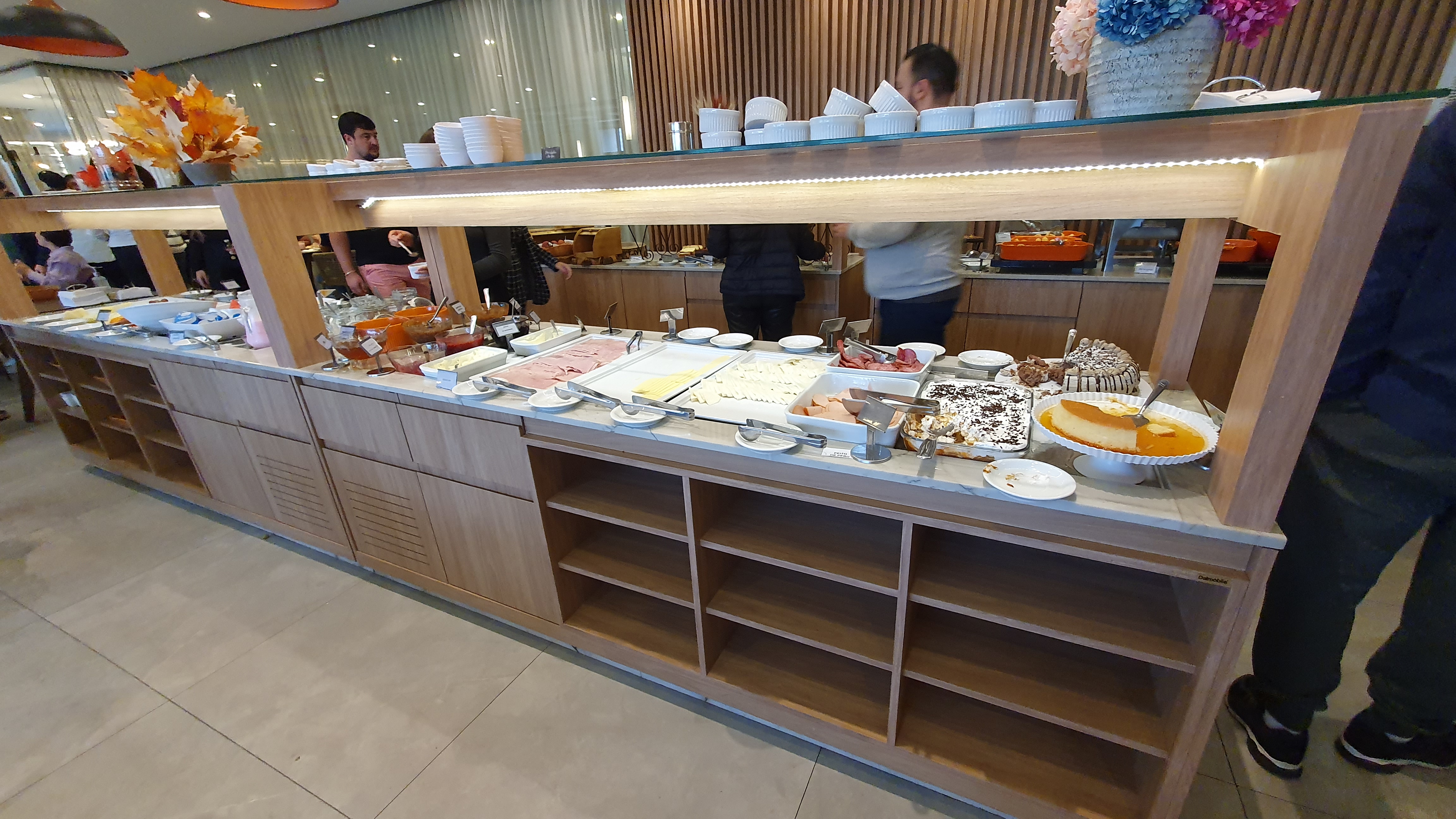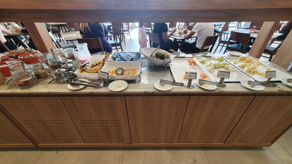 O café da manhã é servido no restaurante e é bem completo, com pães, bolos, salgados, doces, ovos, iogurtes, frios, frutas, cereais, sucos…
